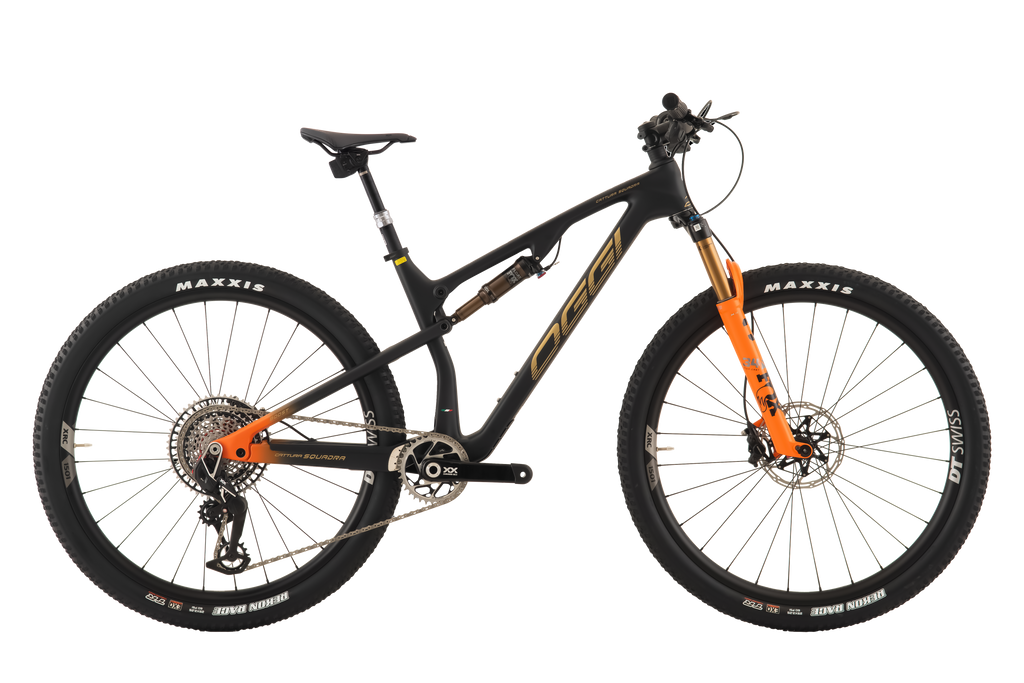 Quadro de fibra de carbono com geometria agressiva para XC e trail, com 120mm de suspensão;